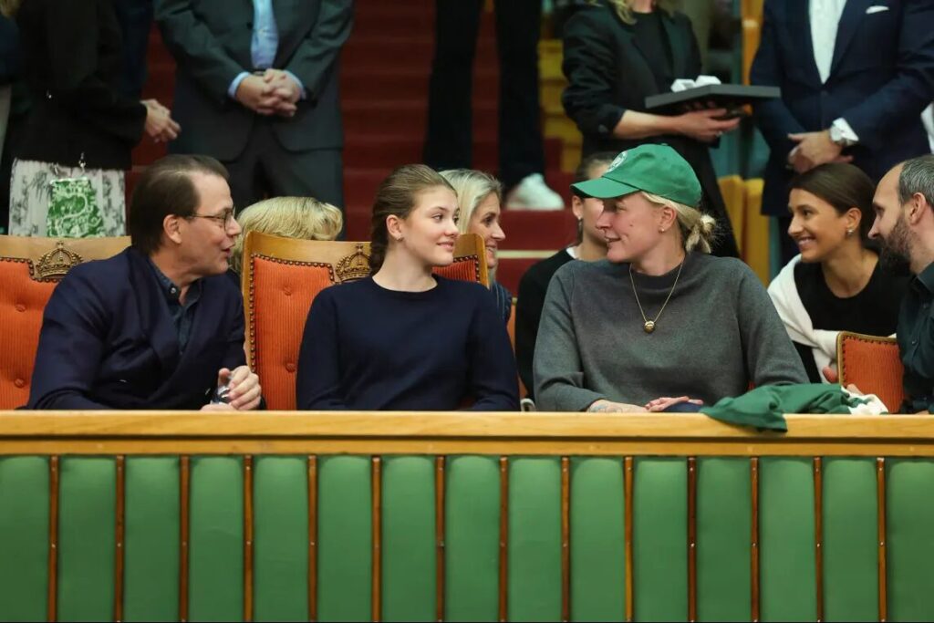 シンプルなグレーニットにブルージーンズというカジュアルスタイル。隣に座ったダニエル王子はネイビーブレザーにチェックシャツ。